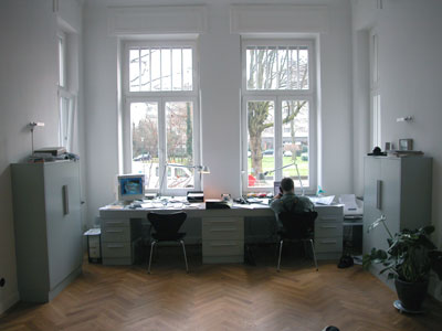 Arbeitsraum: Schreibtisch und Aktenschränke